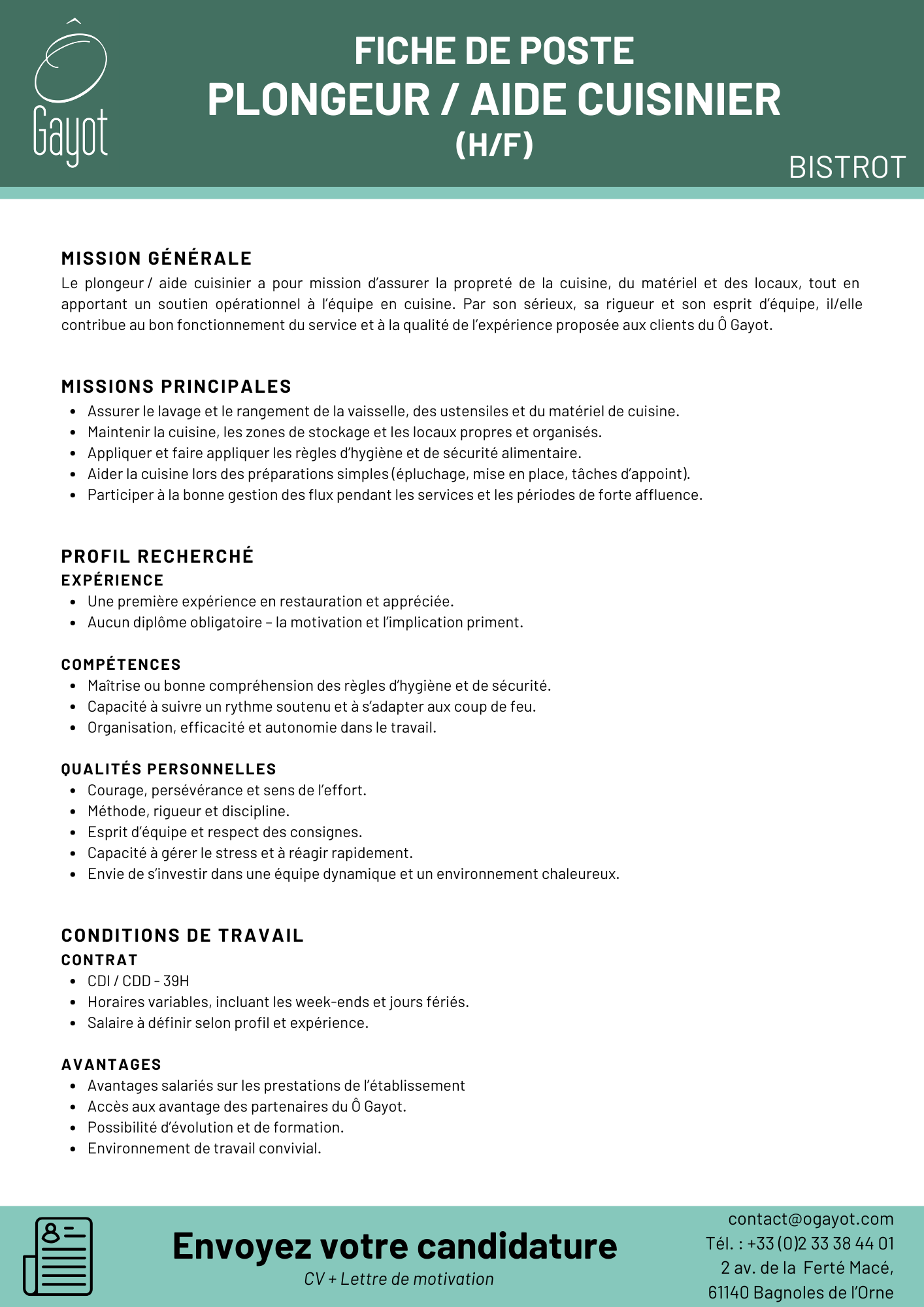 Recrutement PLONGEUR / AIDE CUISINIER - H/F PLONGEUR / AIDE CUISINIER - H/F Référence de l'offre : Plongeur - Aide Cuisinier Date de parution : 03/02/2026 Votre mission Localisation Bagnoles de l'Orne Partager